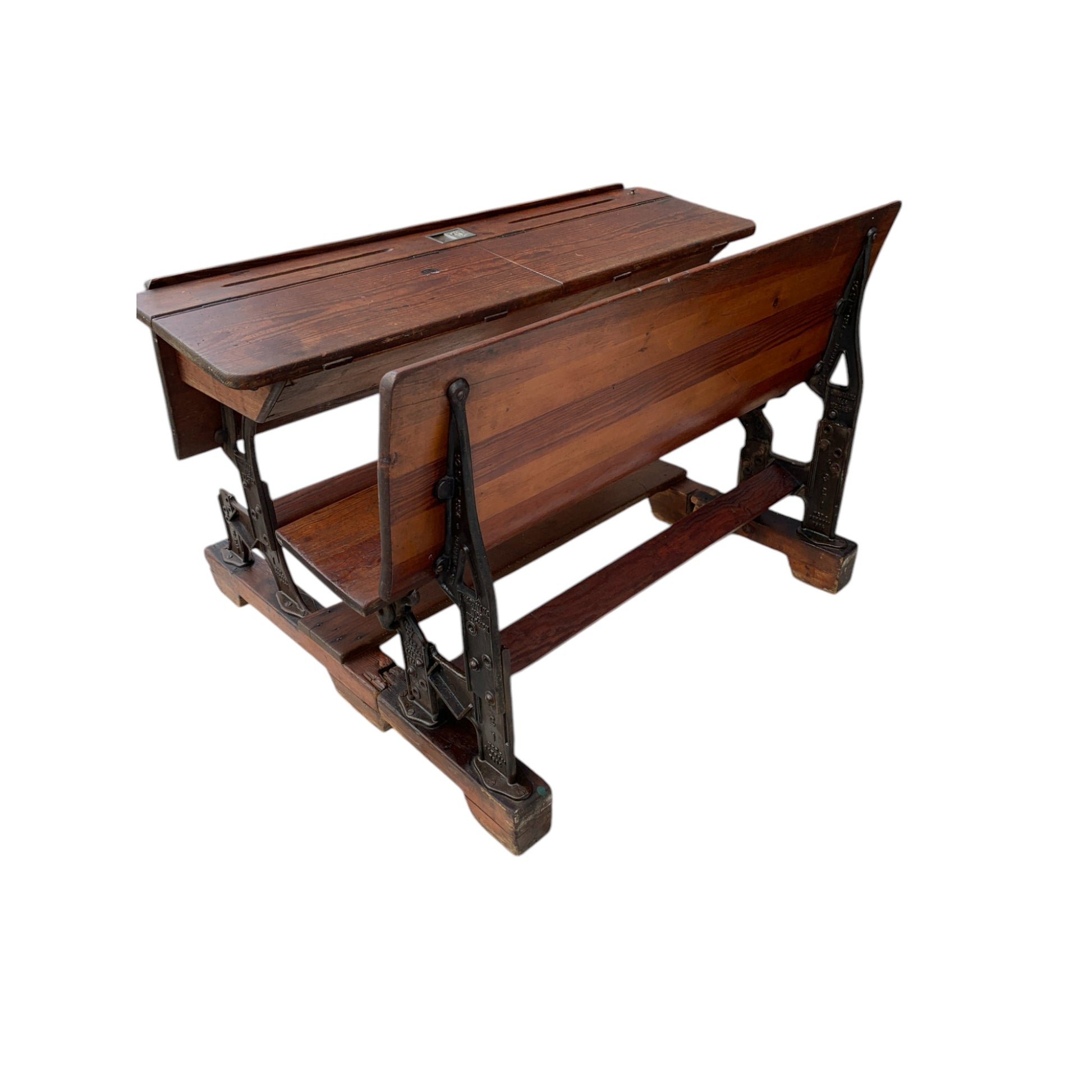 Antique German Double School Desk with double bench seat and wood foot rest - circa 1800’s - desk has original galvanized inkwell and pencil holder grooves. Desktops open and are hinged to access the storage areas. This is a rare piece in great antique condition and would make for a very interesting piece of decor or for actual use in a child's room!