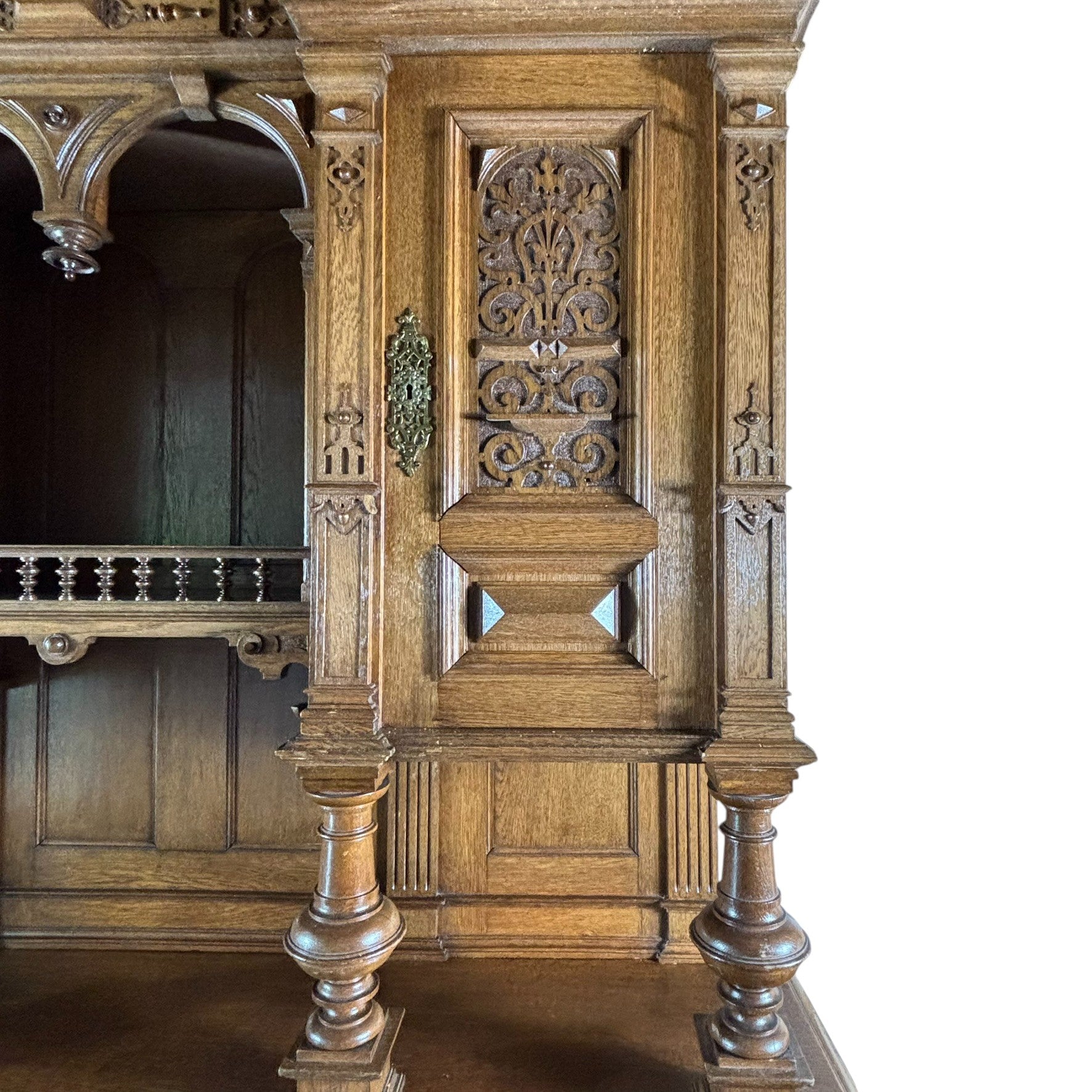 This solidly built, large Wilhelminian period Buffet features rich carvings, ornate details, and decorative elements including heavy brass , reflecting the prevailing taste for opulence and grandeur of the Kaiser Wilhelm II period in pre-War Germany (1870 - 1890). The Buffet can be disassembled into two pieces. The top features a center display shelf flanked by two cabinets with interior shelves. The bottom section includes three drawers, over three doors enclosing interior shelves and three pull out cutting boards, one each above the drawers.