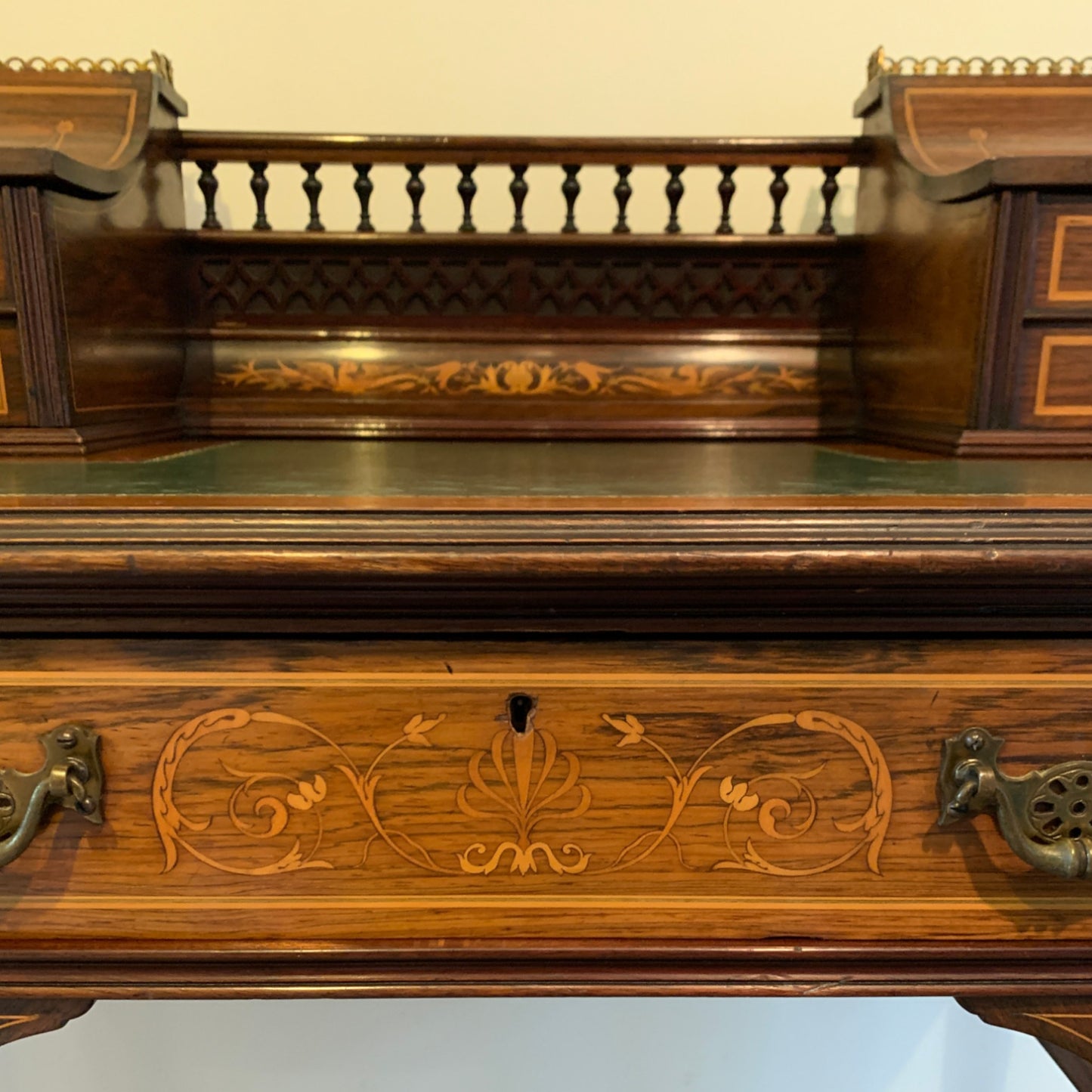 The desk is in very fine condition for a piece of its age. The wooden elements are free of any significant surface marks, but there does appear to have been repairs made to one small arch support element under the main desktop. The green leather writing surface does exhibit wear and minor staining consistent with its age.