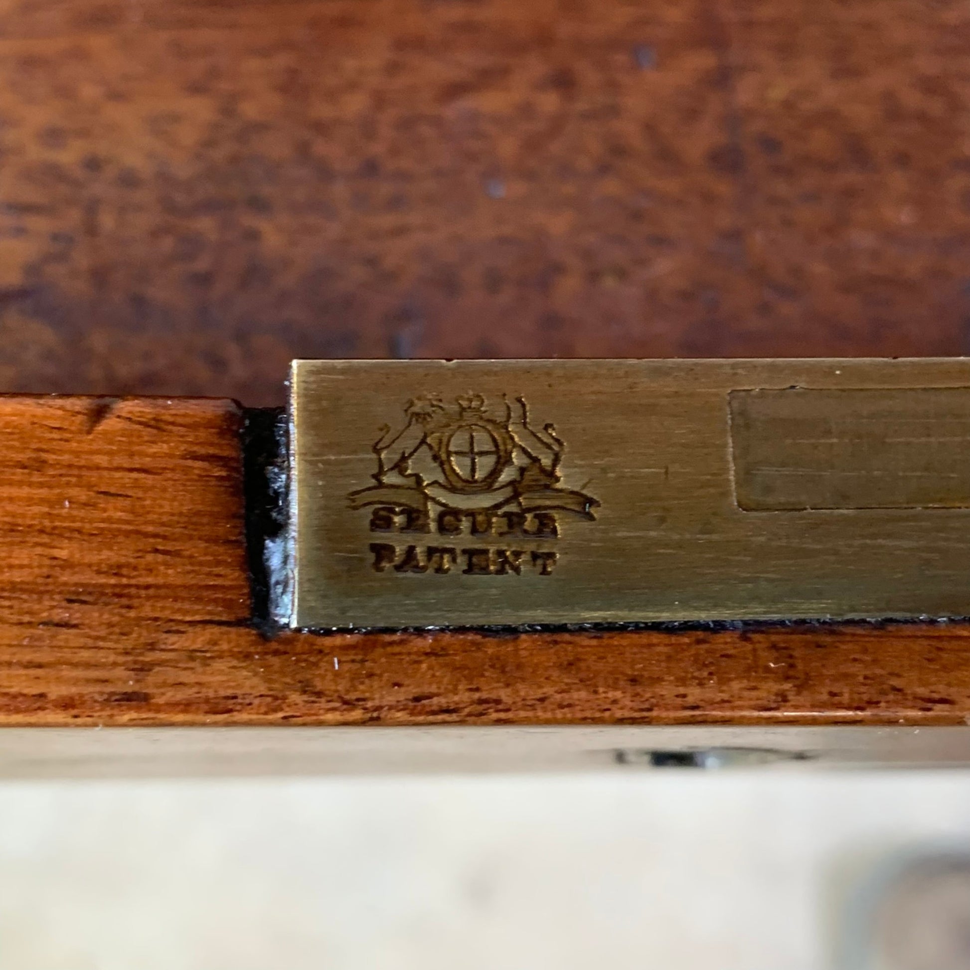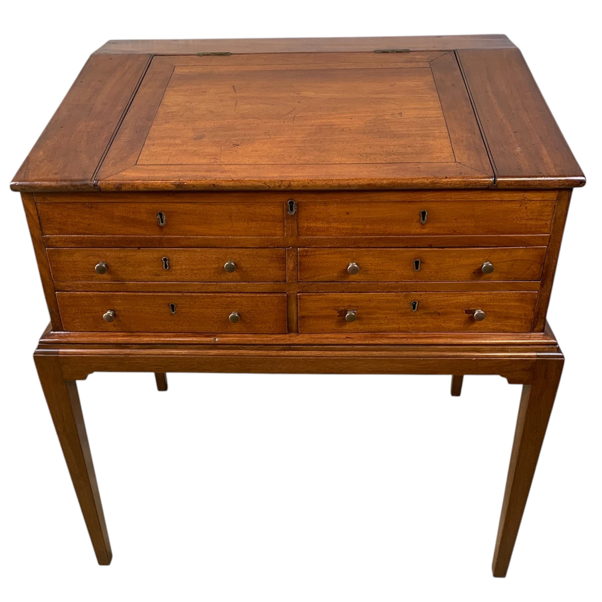 Mid 19th century, mahogany, English Victorian Slant Front Desk in two pieces. The desk features two faux drawers over four dovetailed drawers with brass pulls. Overall, this piece is in very fine condition, but does exhibit some wear, scratches, and marks consistent with its age. A key is included.