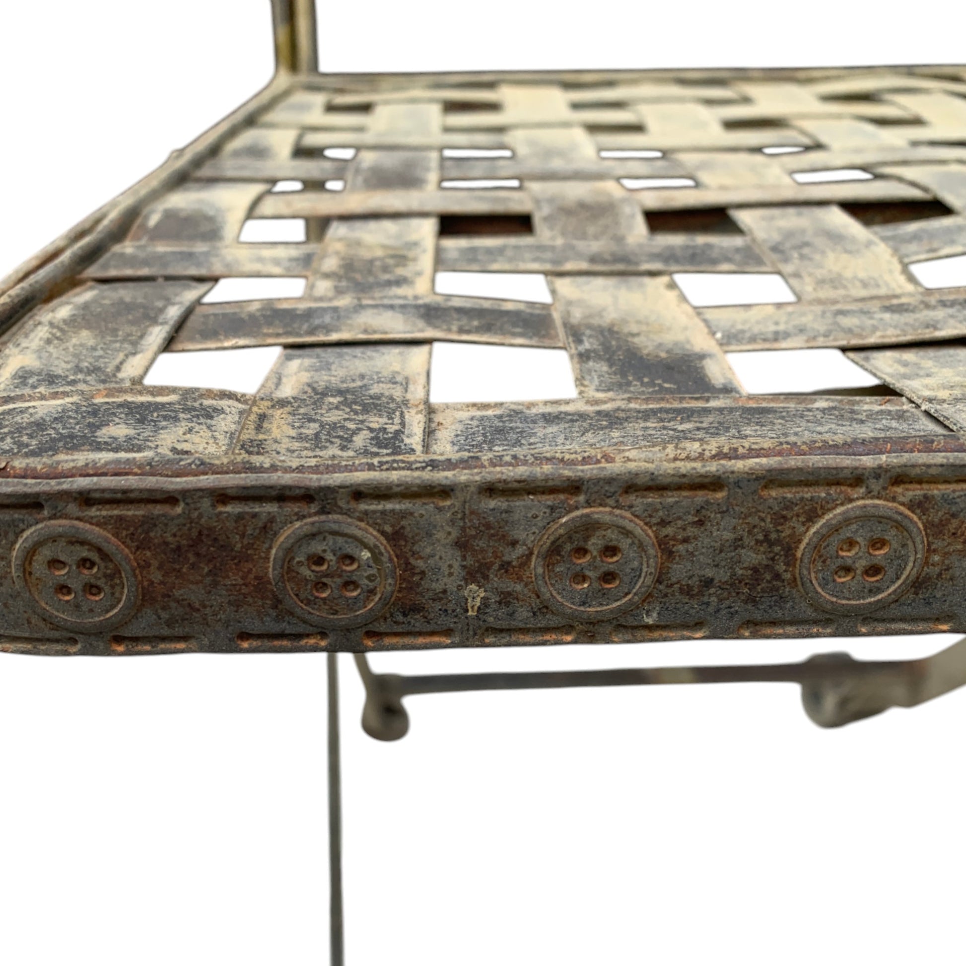 A delightful pair of vintage outdoor folding metal chairs with interwoven strap design featuring faux "buttons" at the edges, whimsical rolled tops and bottoms, and a wonderful verdigris patina. These chairs would make an wonderful addition to an intimate exterior patio or small balcony, as well as a Tuscan-like breakfast nook.