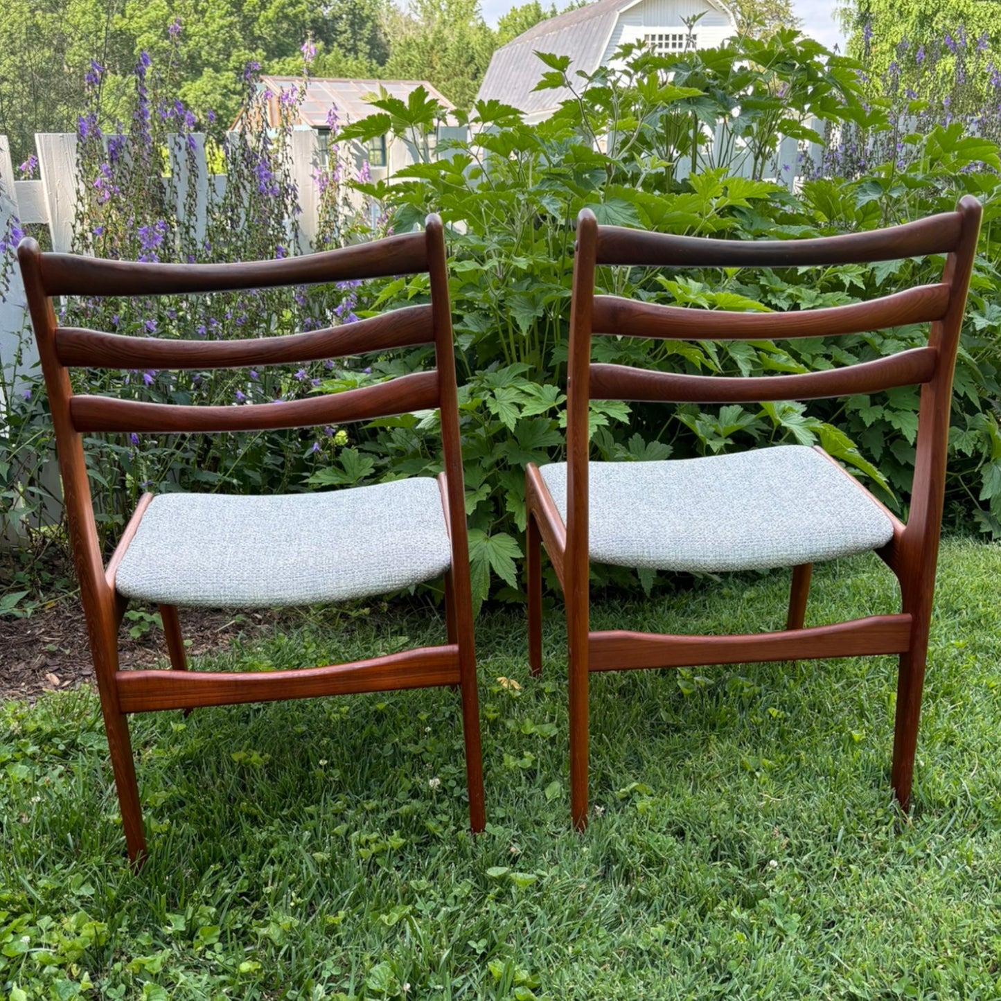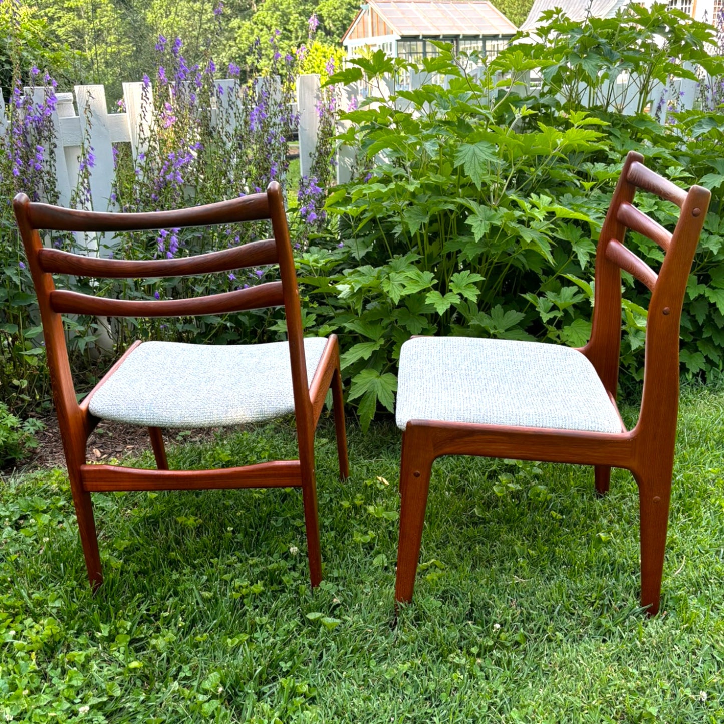 This pair of open construction, mid century modern style dining chairs are sleek and refined pieces featuring teak wood, with a light mahogany finish and upholstered seats. With a timeless design, they add a touch of elegance to any dining space, but would work as side chairs in a library, intimate den or home office. Seats have been recently reupholstered with new, by period appropriate fabric.