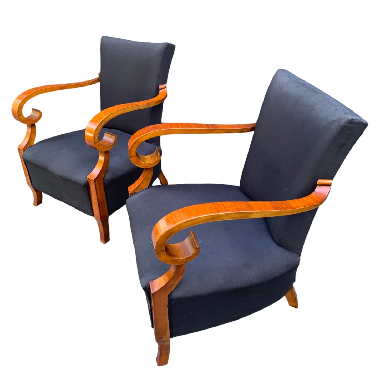 This pair of Empire Style Armchairs exude elegance, with their eye-catching curved lines. While we can't pinpoint their age, the construction suggests that they likely date to the early 20th century @1920's. The chairs are substantial with a generous seat and tall back. Arms curve out from the back of the chair and then curve down into a delicate scroll at the front. The chairs are very comfortable, and the upholstery appears to be original. The color is somewhere between a midnight blue and a deep charcoal grey - please see photos which were taken in natural light.